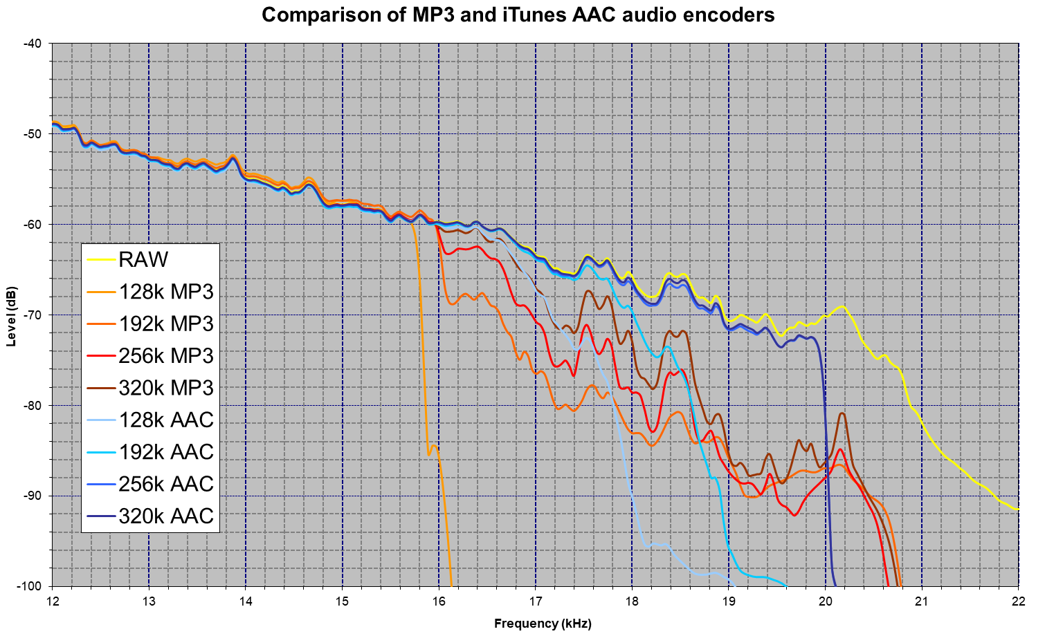 The aim here is to choose a compression format with which to encode an entire CD collection for easy access in a media center.I've taken a typical 4 minute song and encoded it using LAME mp3 and iTunes AAC at various bit-rates and then analysed their spectral content and compared them with the raw original.