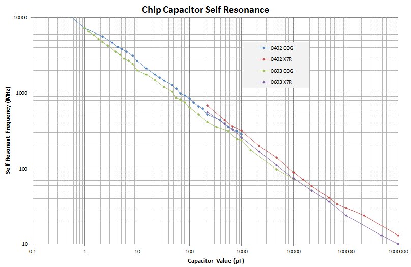 The figure above plots the Self Resonant Frequency for a range of values of 0402 & 0603 capacitors made from both COG and X7R dielectric materials. Click the picture for a larger view