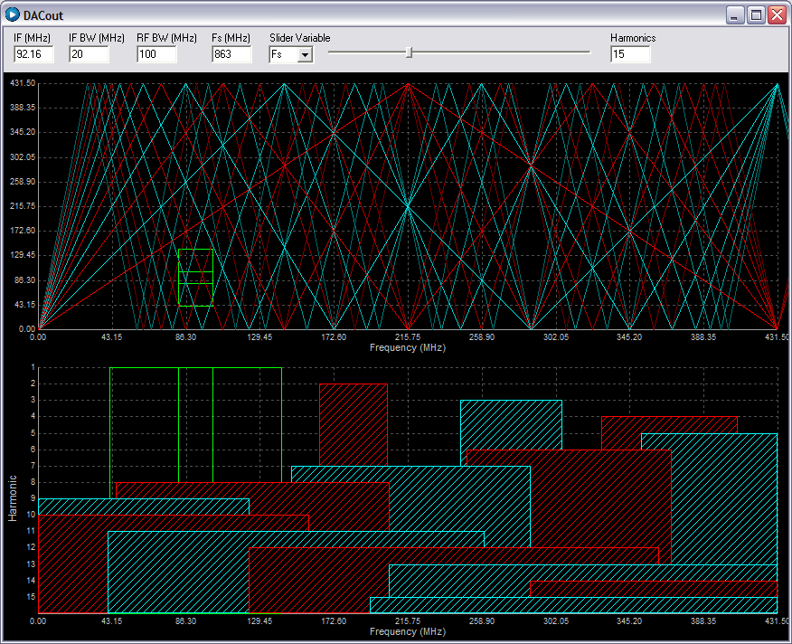 This piece of software was developed to assist frequency planning.When a DAC is used to output a signal, care must be taken to ensure that harmonics of that signal do not get aliased back in-band. This is particularly problematic when the DAC is producing a narrowband signal and will produce a narrowband spurious of significant amplitude.